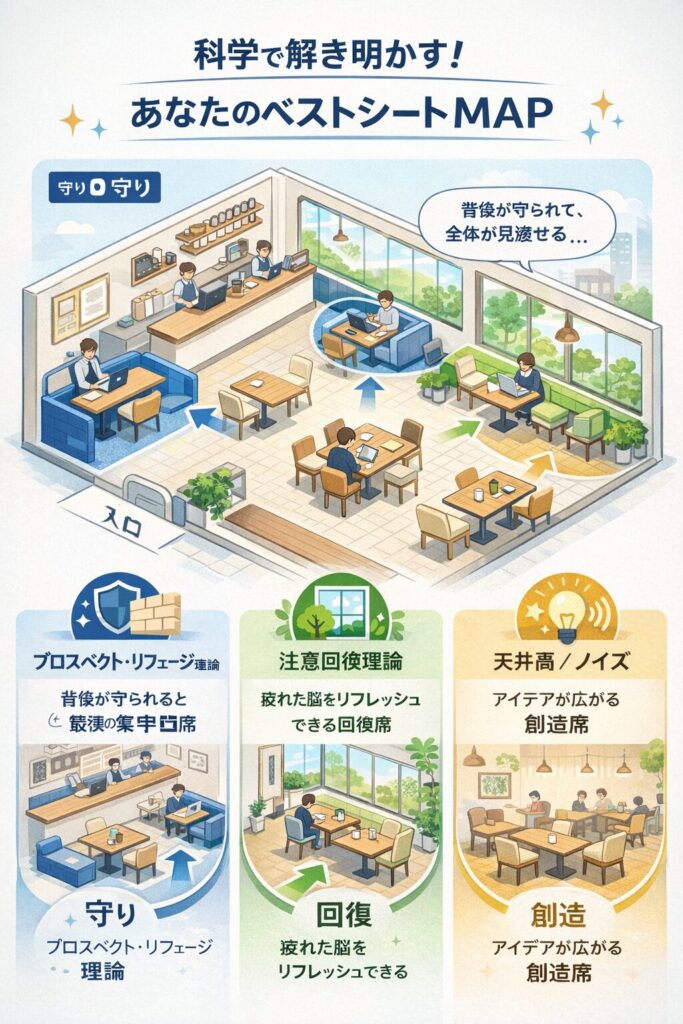 - 【守り】プロスペクト・リフュージ理論: 背後が守られ、全体が見渡せる席で脳を安心させる。