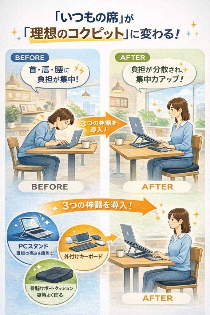 カフェという理想的とは言えない環境でも、以下の「3つの神器」を導入するだけで、あなたの席は人間工学的に最適化された空間に変わります。