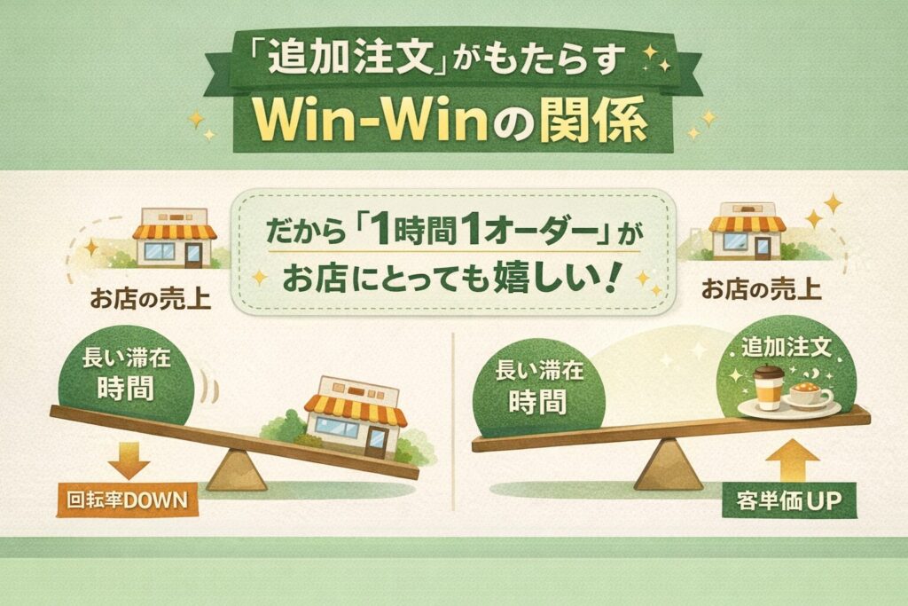 なぜなら、お店の売上は「客単価 × 客数」で決まります。長時間滞在は客数(回転率)を下げますが、適切な追加注文で客単価を上げてくれるお客様は、お店にとって紛れもない「上客」なのです。この視点を持つだけで、気持ちが楽になりますよ。