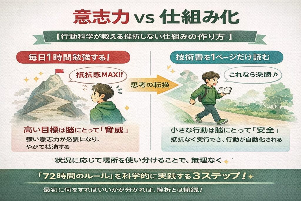 この記事では、精神論を100%排除し、行動科学に基づいた「挫折しようがない仕組み」の作り方を、今日からできる具体的なステップで解説します。